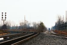 View looking east of Conrail's Chicago Line at Whiting, IN. This was formerly Lake Jct., an interlocking built by Penn Central to connect the former PRR with the former NYC. After Conrail abandoned the PRR through East Chicago in 1978, all through traffic shifted to the NYC alignment east of this location. In this photo, a Conrail unit approaches on the former PRR alignment, which by this date in November 1987, was a spur to the Amoco Refinery. Doug Davidson photo with permission