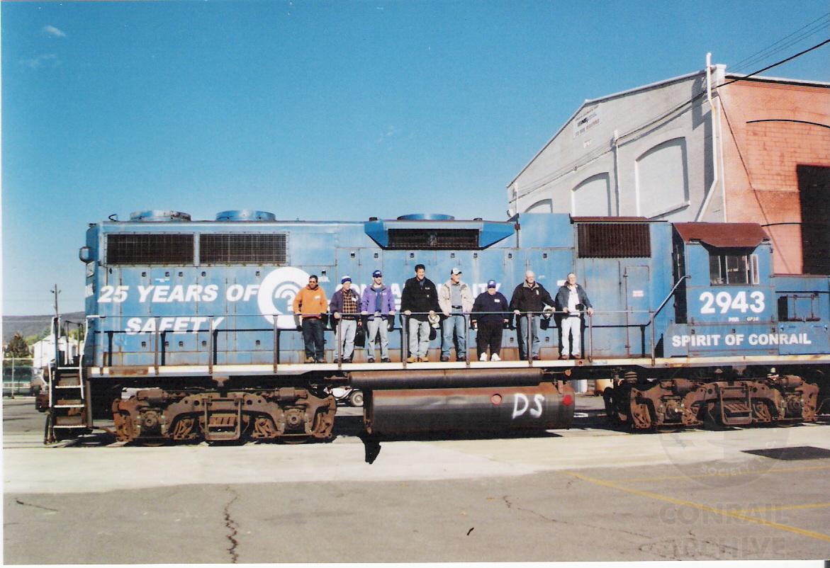 All the former Conrail employees in the CRHS pose on the 2943, Spirit of Conrail at the historic Juniata diesel shops in Altoona, PA on October 26th, 2008