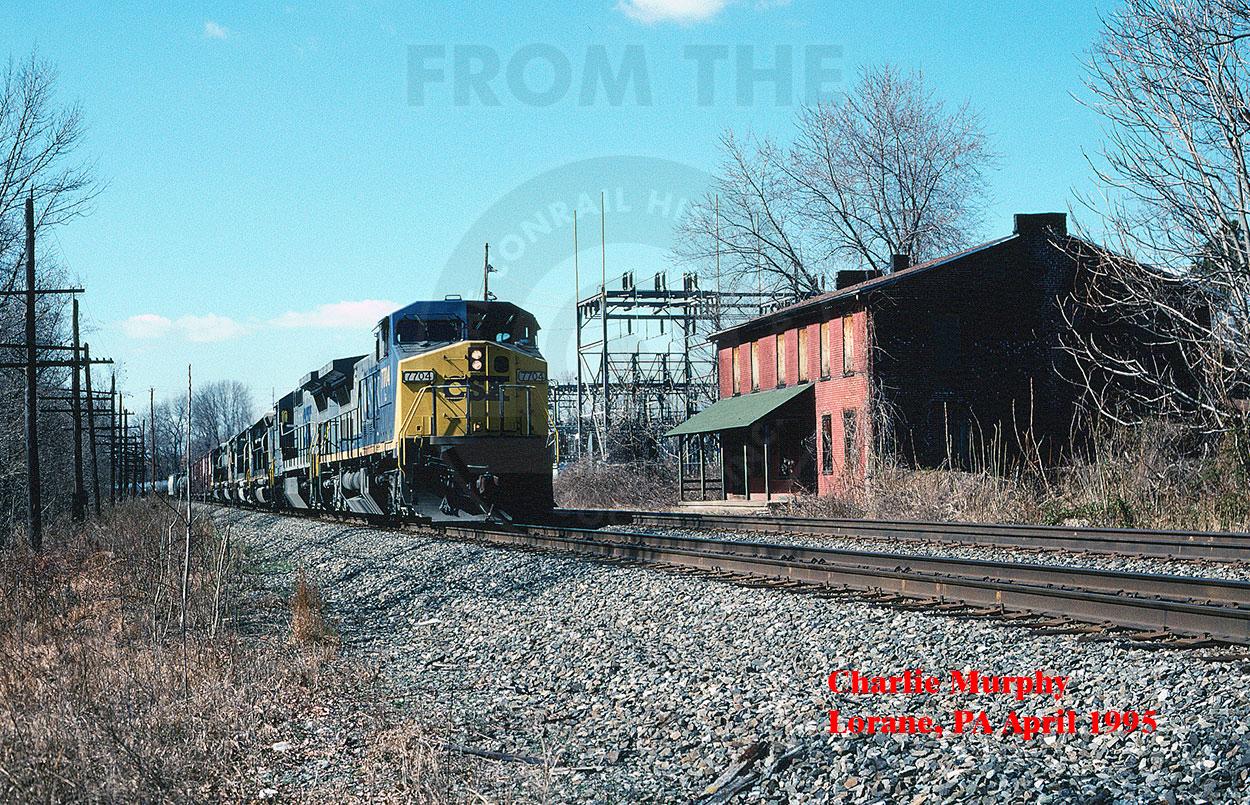 Conrail's ALCS led by CSX C40-8W #7704 passes eastbound by Lorane, PA just east of Reading, PA in early April 1995. The area was once known as Exeter Station. The circa 1860's structure was built by Washington Kissinger as a hotel. The hotel was later used as a residence but had been vacant for many years. I believe there were plans to restore it, but a fire later destroyed it.