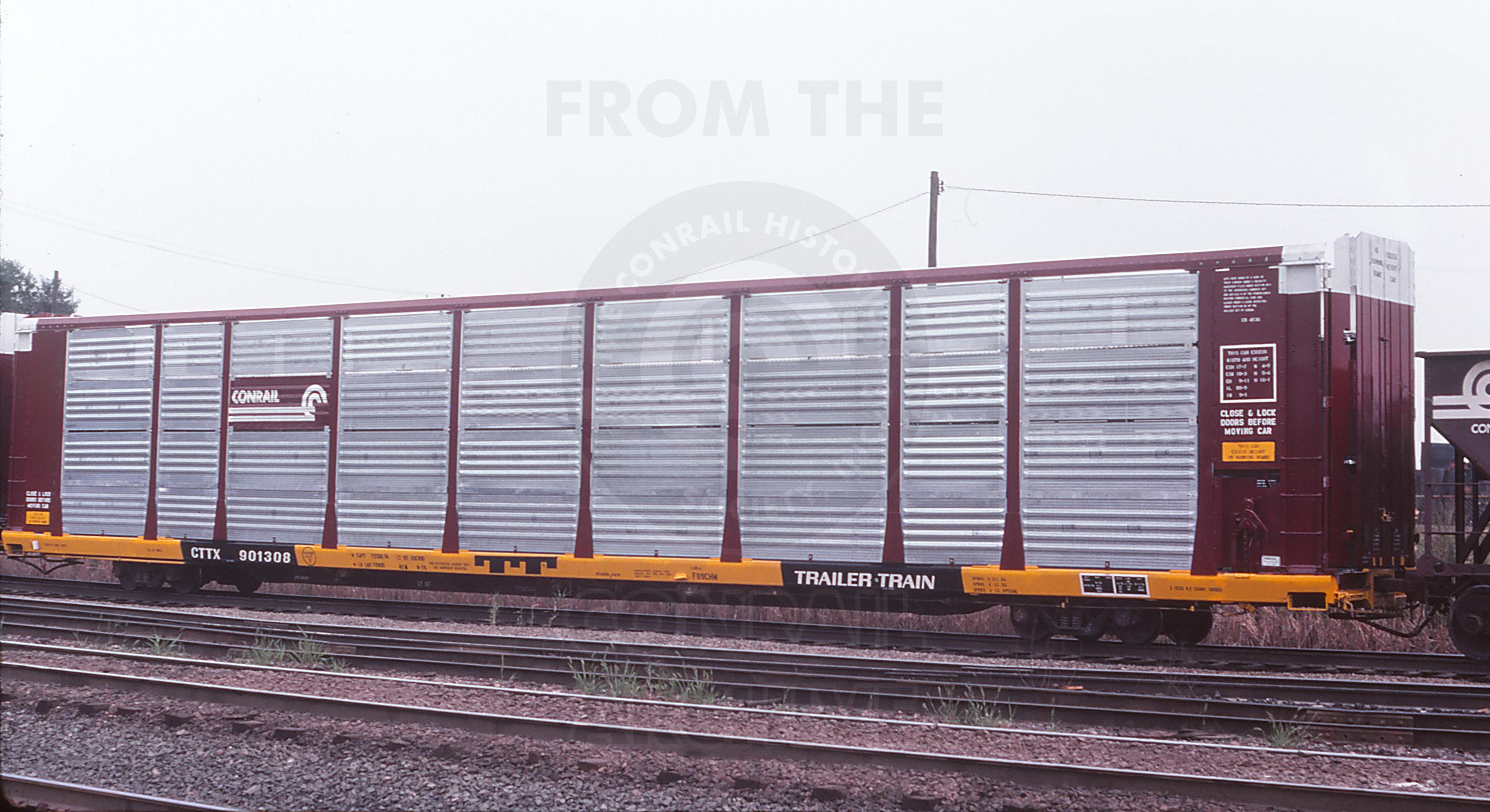 Previous Next Photo By Walter Wilk collection of Jeff Weaver CTTX 901308 is seen here in Sept of 1978. Year 1978 Original Date 9/1/78 Equipment Type CTTX Tri-Levels Collection CRHS Conrail Photo Archive Contributions