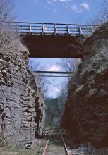 With only weeks remaining in service for this track, this view is looking east through what was a tunnel completed in 1887 and daylighted in 1929. The road bridge carried aptly named Tunnel Road over the track after daylighting, and an oil company pipeline crossing the cut is seen beyond the bridge. There was a 2% grade to the tunnel from the east. Track speed in the final years of operation through to Berwick was 5 mph over the 25 miles of track that was torn up from MP 14 to Berwick in 1982.