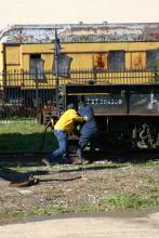 Previous Next Photo By Ed Kapuscinski The crew deploys the outriggers on the wreck derrick. Collection CRHS Conrail Photo Archive Contributions
