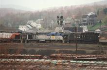 D&H RS-3's in orange and white and the traditional blue and gray paint schemes rest next to ex-PC RS-11 7619 at one of the Juniata shops deadlines in March, 1978.