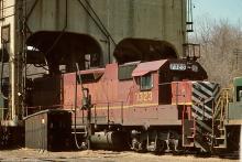 Mixed in with CR power at the Bethlehem engine terminal, former LV GP38-2 323, and now D&H 7323, idles under the steam-era coaling tower in April, 1977.