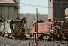 LV RS-3 211 (CR 5487) idling alongside D&H GP39-2 7410 (ex-RDG 3410) and CR NW-2 9243 (ex-LV 181) at Bethlehem engine terminal in April, 1977.