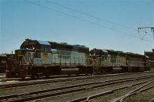 A trio of D&H GP-39-2's, led by 7608, mixes with CR power at Enola in June, 1977.