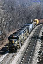 D&H train MB-1 heads West with 4 lightning stripes on CR's Southern Tier on a bright March afternoon.