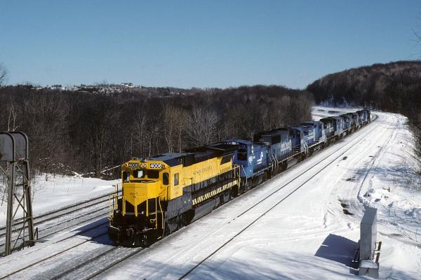 A trio of D&H GP-39-2's ready to roll out of Allentown yard. D&H 7617 leads 7411 and 7401 (ex-RDG 3411 and 3401) in April, 1977.