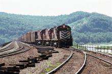 ALCO's #406, #415 and #404 on Rockville bridge, Harrisburg, PA. The freight will switch onto the Northern Central line to Buffalo, NY. The date is July 17, 1976. They are just a fond memory now!
