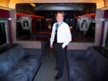 Previous Next Lookin' sharp, CHRS member Ed Kapuscinski poses for just a moment in the beautiful Warrior Ridge parlor car. After this photo, it was back to work preparing for the arrival of our first class passengers. Photo By Joe Marchinchin Year 2009 Original Date 10/17/09 Collection CRHS Conrail Photo Archive Contributions