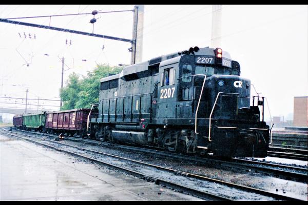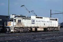 Before Conrail pulled the plug on the former PRR electrified freight lines they tested a couple of EMD electric demonstrators. Here EMDX model GM6C #1975 rests at Harrisburg, PA in August 1978.