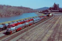 EMDX 7002 and a pair of other SD70M test beds are seen on train OIEN waiting for a re-crew at Bethlehem, PA on 3/31/2993. The brand-new units sit in stark contrast to the overgrown remains of Florence Yard...in a mere 2 and a half years, the blast furnaces in the background at Bethlehem Steel will all be cold and empty.