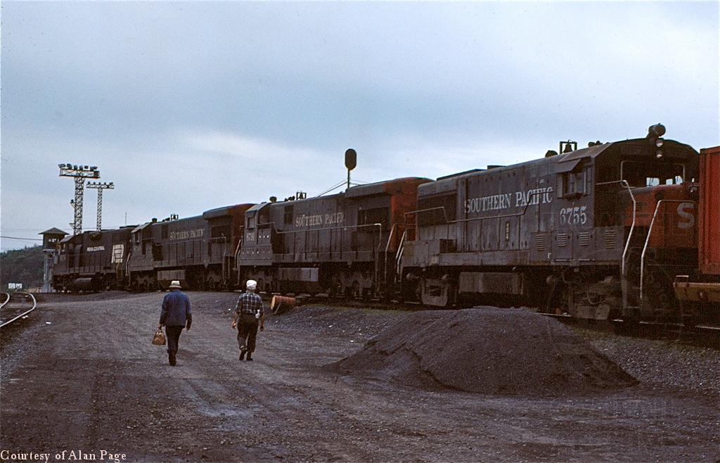 Southern Pacific U33's 8740 and 8791, and U25B 6755 rest behind a former PC GP-38-2 during a crew change by the eastbound Enola yard tower.