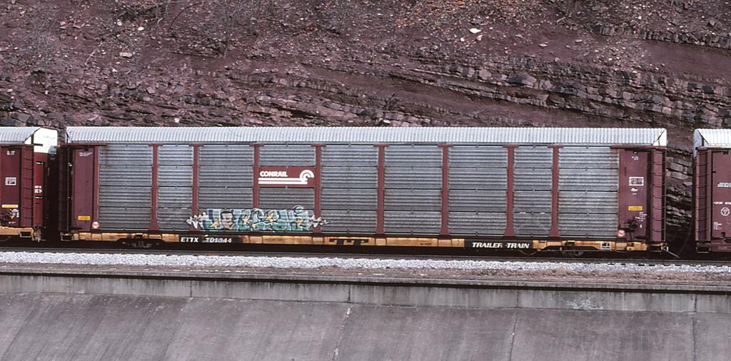 ETTX 701344 is seen in CSX Q217-05 at Cumberland MD on 2/6/98. Rack number is CR 7325 and was built 4-89.
