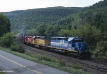 A Westbound CP/D&H stack train rolls thru the S - Curves at MP 318.