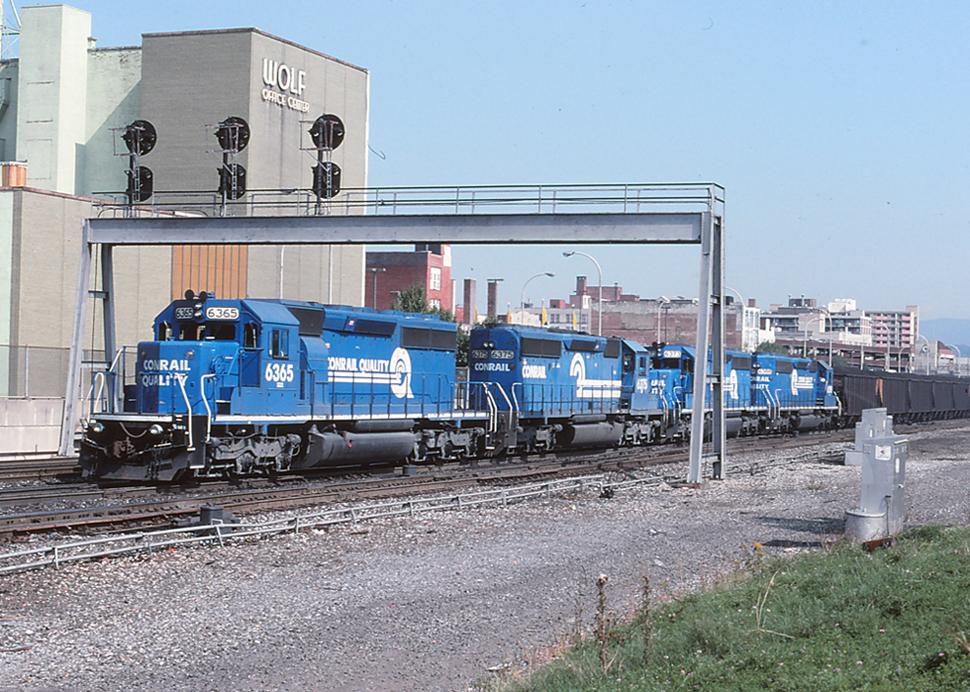 CR 6365, 6375, 6373 and 6388 are seen on the rear of a EB PPLX coal train at Altoona PA on 10/5/97.