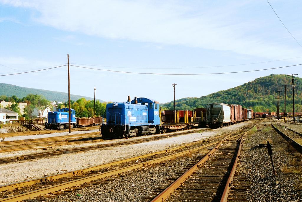 Conrail car shops yard at Holidaysburg, PA on Oct. 3, 1994. The blue switcher closest to the camera is CR 9340, the second switcher in the background is the other unit specially assigned to switch the car shop yard. Doug Davidson photo with permission