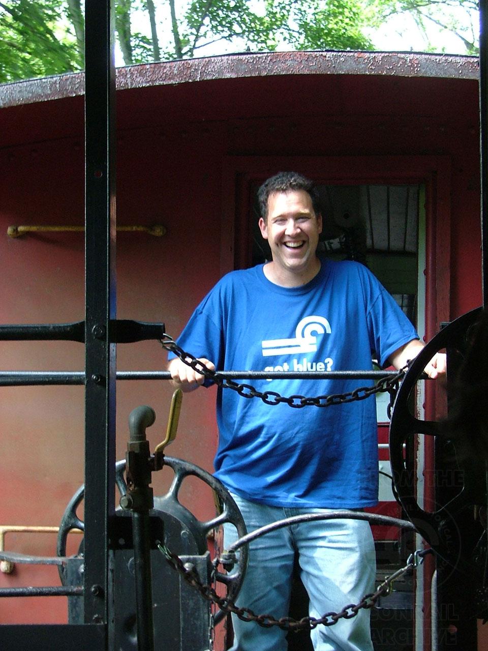 Previous Next Photo By Ed Kapuscinski Our treasurer enjoys the open air of the CNJ car's end platform. Collection CRHS Conrail Photo Archive Contributions
