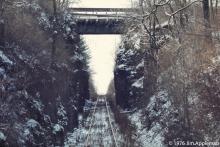 From the leading platform of a GP9, this view is looking west through what was a tunnel completed in 1887 and daylighted in 1929. The bridge in this view carried later aptly named Tunnel Road over the track after daylighting, and an oil company pipeline lay exposed as it crossed above the track on this side of the bridge. After abandonment and dismantling of the line east of M.P. 14 to Berwick, the right-of-way was filled in for Tunnel Road to cross, eliminating the bridge. Now only the name Tunnel Road carries on the legacy of what actually existed when that road actually crossed a railroad tunnel.
