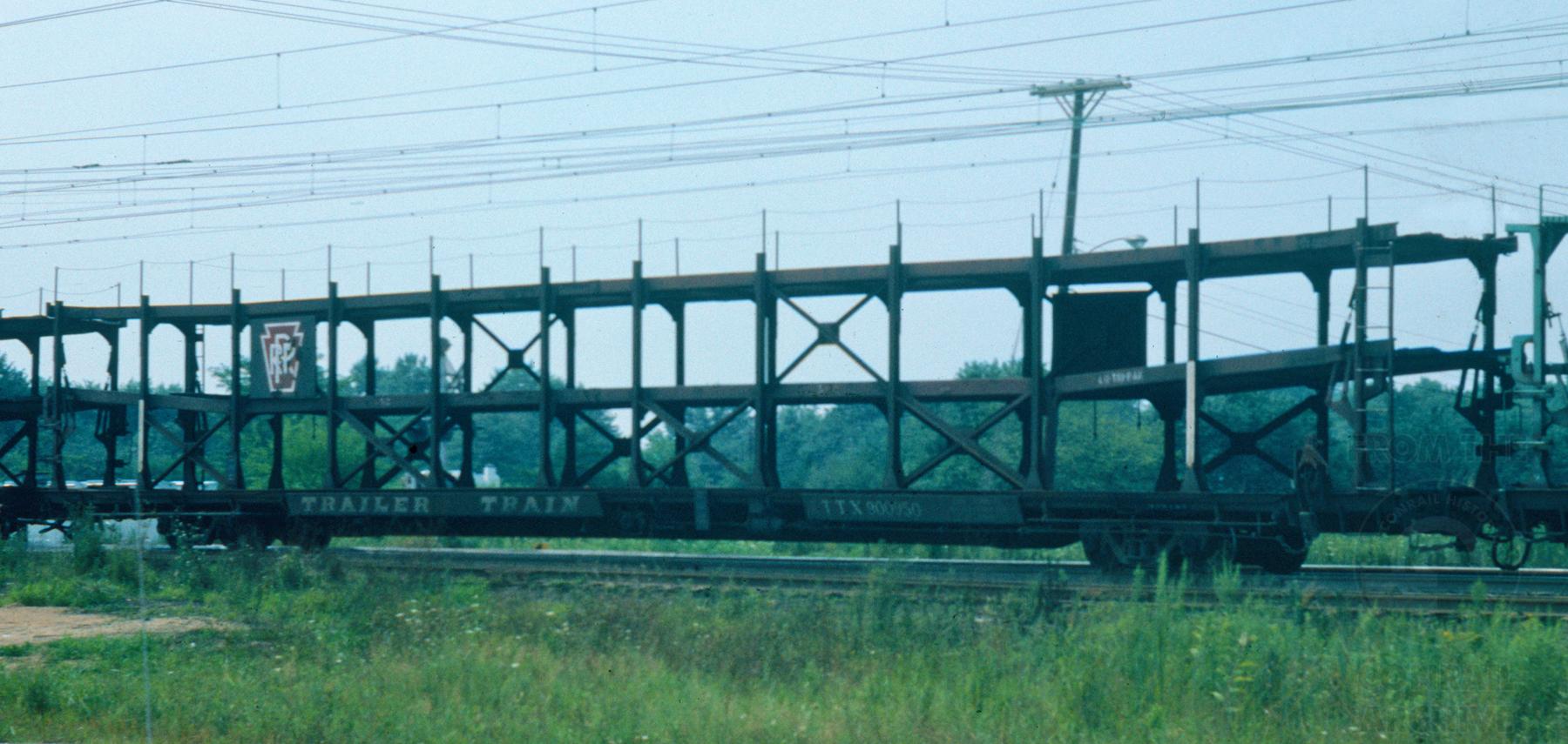 KTTX 900950 with a PRR "Lo-Tri-Pak" rack was photographed at Davis (S. Chapel St.), Newark, DE on 8/15/76.