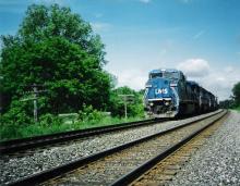 Conrail Mail-8M with a LMS leader east of Kendallville, IN back in June 1996
