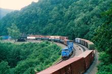 LMS C40-8W No. 710 leads an eastbound manifest around Horse Shoe Curve, while another manifest grinds up grade, in August 1995. Doug Davidson photo with permission