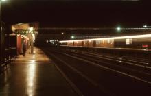 Metropark, Iselin, NJ. on a rainy night on April 27, 1976. This station is on the ex PRR and Penn Central main line, now known as Amtrak Northeast Corridor. Back in the day, Penn Central commuter trains and express trains (Philadelphia Clockers) would stop at this station after the old Iselin, NJ station was closed. Conrail freights used this 4 track main line until the late 1980's. This station is where we would get many pictures of Conrail freights before Amtrak became passenger only trackage.