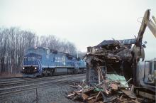 MO tower in Cresson is almost gone as Conrail 6123 passes the pile on Dec 7th, 1998, a sad end to a classic PRR tower.