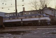CR-operated NJDOT E-8A 4305 (ex-PC 4272, rebuilt by ICG 10/78) prepares to couple up to her train at South Amboy station in November, 1978.