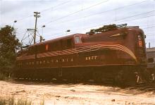 CR-operated NJT GG-1 4877 in PRR livery with rear pan up at South Amboy in July, 1981.