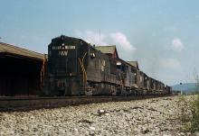 A Westbound D&H train with 7 units, and no 2 alike, leaves Hornell as it rolls by the station.