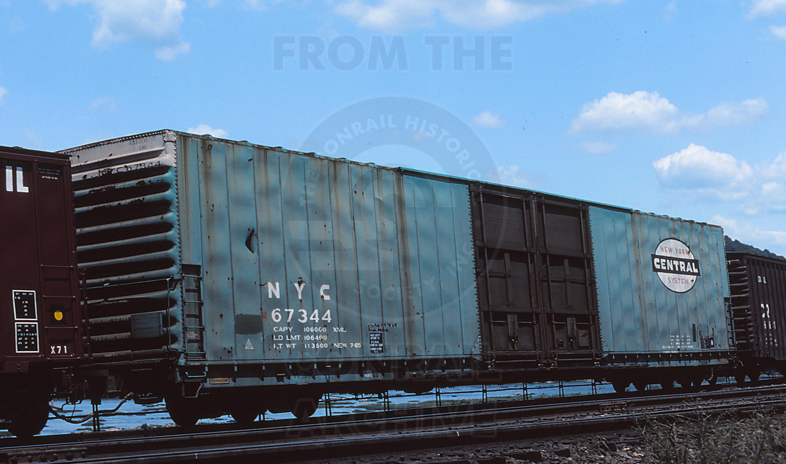 NYC 67344 is seen crossing Rockville Bridge at Marysville, PA in July of 1979. Car was built 7-65 by P-S as part of Lot 9029B. It was later restenciled to CR 293215 and was then renumbered again to CR 244053 which was deleted on 1/11/10.