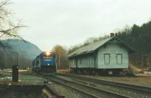 PWSE rolls past the station in Chester, MA. at 15:51 on Jan. 20, 1990. The building had just been uprooted from it's origional location, the light, bare spot just to the left of the engines, and moved across the tracks. After a new concrete foundation is completed the station will be positioned onto it, about 50 ft. further back from the tracks. Prospect St. undergrade is in the foreground.