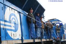 Previous Next With the rain coming down, Mike Swinnerton, Steve Ondik and Lance Myers take cover under our SD80MAC! Photo By Kris Klemick Year 2008 Original Date 10/25/08 Collection CRHS Conrail Photo Archive Contributions