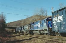 NESE about to duck beneath the Middlefield Rd. overhead near MP 127 in Chester, MA. on March 25, 1998.