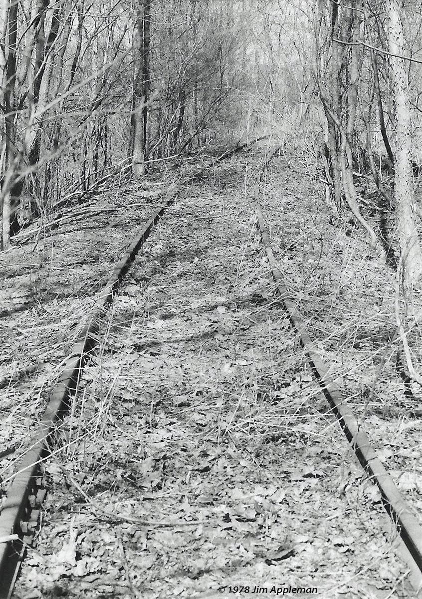 Out of service decades before the creation of Conrail, this connecting track between the abandoned and dismantled Reading branch from Rupert to Benton and PRR's branch from Watsontown to Berwick was still in place through abandonment of that line from M.P. 14 to Berwick by Conrail in 1978. After special trains stopped running to the fair in Bloomsburg, this connection was rarely, if ever, used. This connection was where the Reading branch followed along the east bank of Fishing Creek and the PRR crossed over Fishing Creek and the Reading branch at Paper Mill in the area of Bloomsburg and Lightstreet, PA. This view is looking upgrade towards the still active at that date, Watsontown-Berwick Secondary.