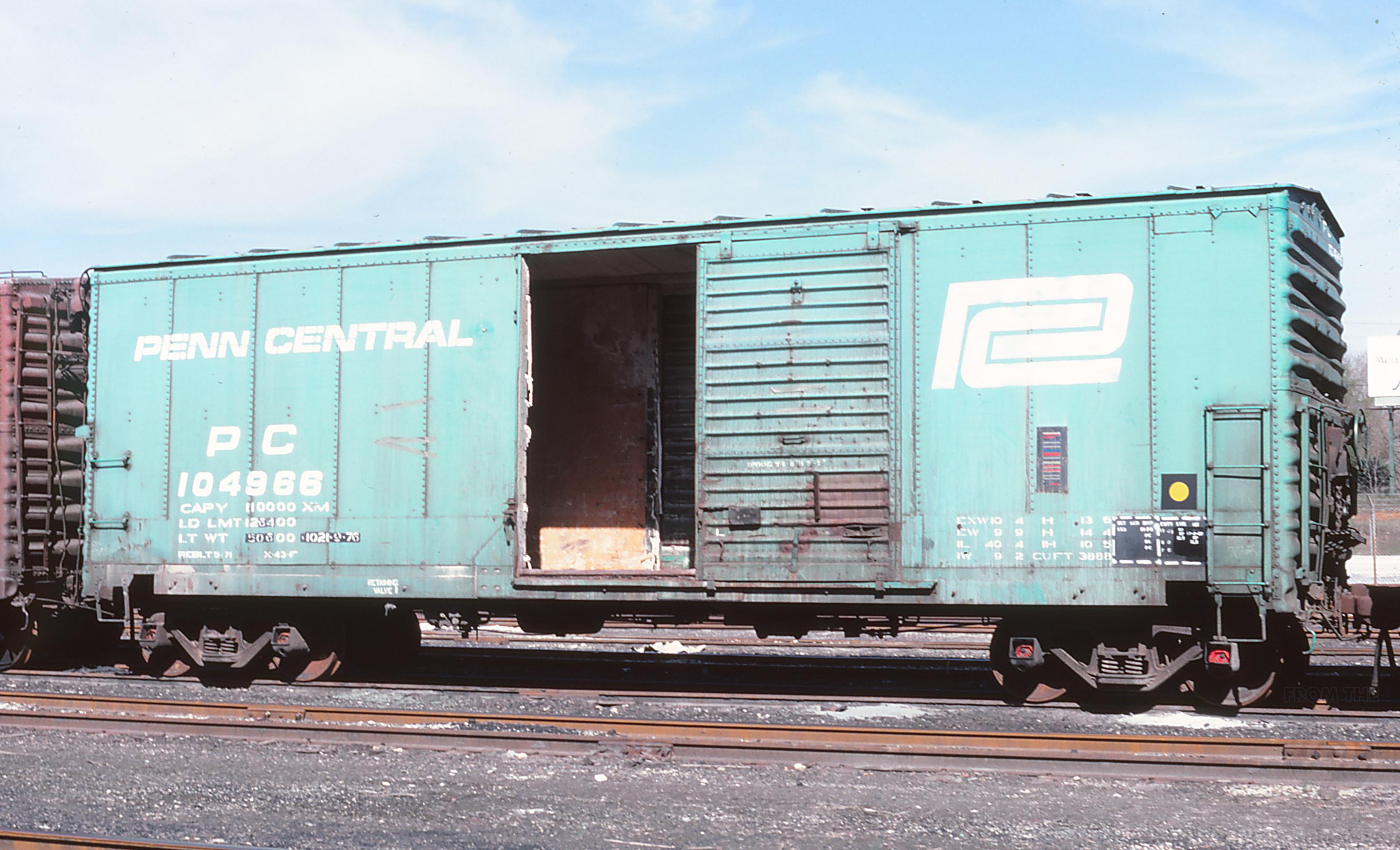 PC 104966 was photographed at York, PA on 4/21/81. Car is ex NYC unknown andwas built 1-53 by DSI as part of the NYC 179000-179999 Lot 853B.It was rebuilt 5-71 by PC and reclassed to X43F.