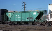 Heading east (north) through Akron with a load of sand, I believe this car started life as a PRR car. Many of these PC cars never got Conrail paint and could be found in green into the late 80's.