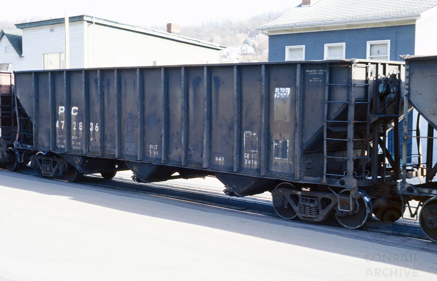 Previous Next Photo By Jeff Weaver PC 472836 was photographed on the MGA at West Brownsville, PA on 1/30/93. Car is ex PRR 180857 and was built 5-64. It was deleted on 8-4-94 and sold as SPSX 500035, which was deleted on 3-12-01. Year 1993 Original Date 1/30/93 Equipment Type Class H43 Predecessor Paint Scheme PC Collection CRHS Conrail Photo Archive Contributions