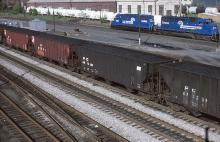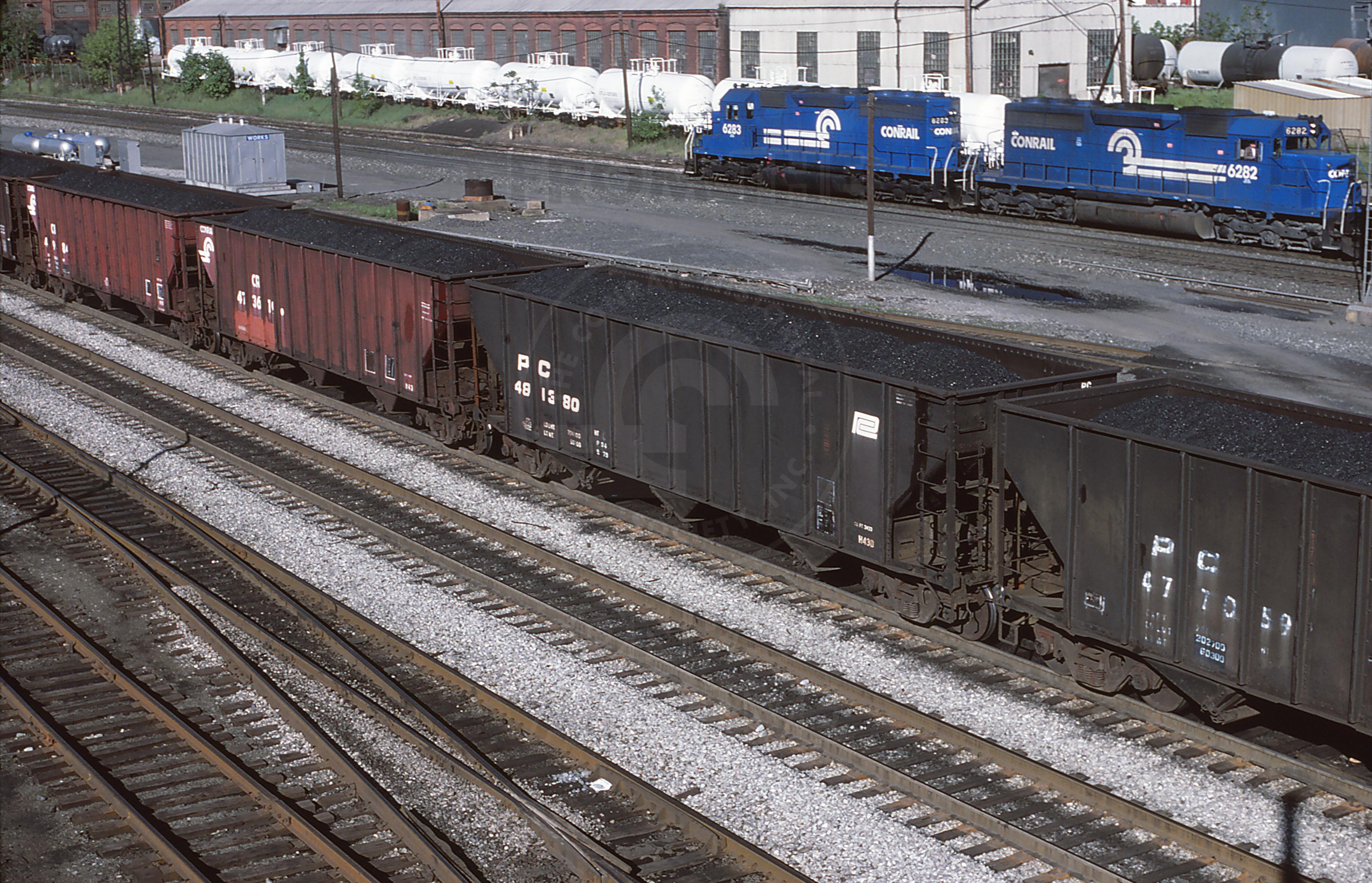 PC 481380 is seen here at Altoona, PA sometime in the late 80s/early 90. Car was built 12-71 by Bethlehem Steel.It wasrebuilt to a G52R class Coalporter at Hollidaysburg in Aug of 1992and became CR 506217. It was then deleted 10/8/09 by NS.