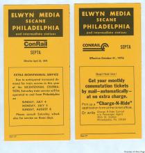 The "Elwyn Media to Philadelphia" April 25, 1976 timetable shows the new "ConRail" logo, with lines above and below.