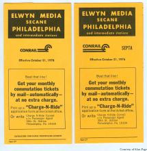 Following the April 25, 1976 PC to "ConRail" revision of the "Elwyn Media to Philadelphia" timetable, a second revision was released in October 31, 1976 showing the familiar "CONRAIL" and wheels on rails logo.