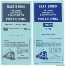 During Septa's Philadelphia commuter operations transition from PC-contracted operations to Conrail in April, 1976, the "Harrisburg to Philadelphia" April 25, 1976 timetable shows "Penn Central," and the PC logo replaced with the new "ConRail" logo, with lines above and below.