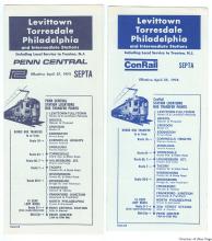 During Septa's Philadelphia commuter operations transition from PC-contracted operations to ConRail in April, 1976, the "Levittown to Philadelphia" April 25, 1976 timetable shows "Penn Central" and the PC logo from the April 27, 1975 timetable replaced with the new "ConRail" logo, with lines above and below.