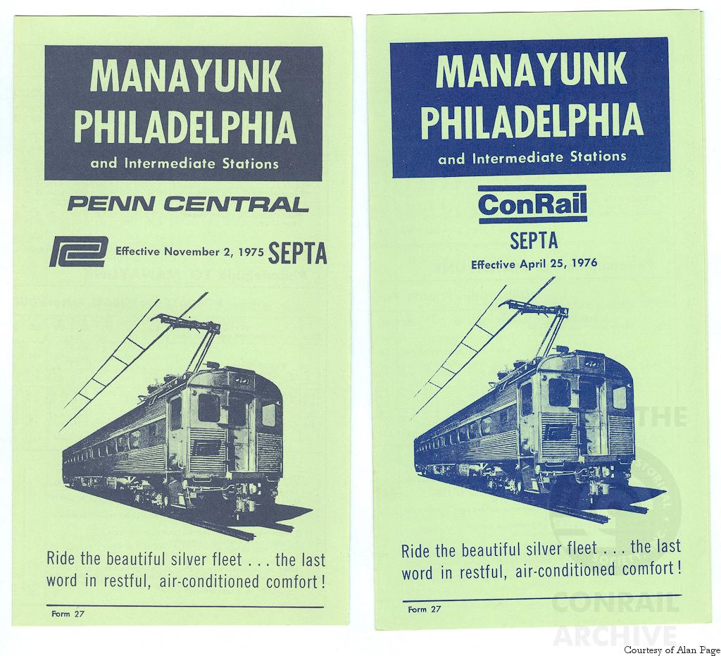 During Septa's Philadelphia commuter operations transition from PC-contracted operations to ConRail in April, 1976, the "Manayunk to Philadelphia" April 25, 1976 timetable shows "Penn Central," and the PC logo, replaced with the new "ConRail" logo, with lines above and below.