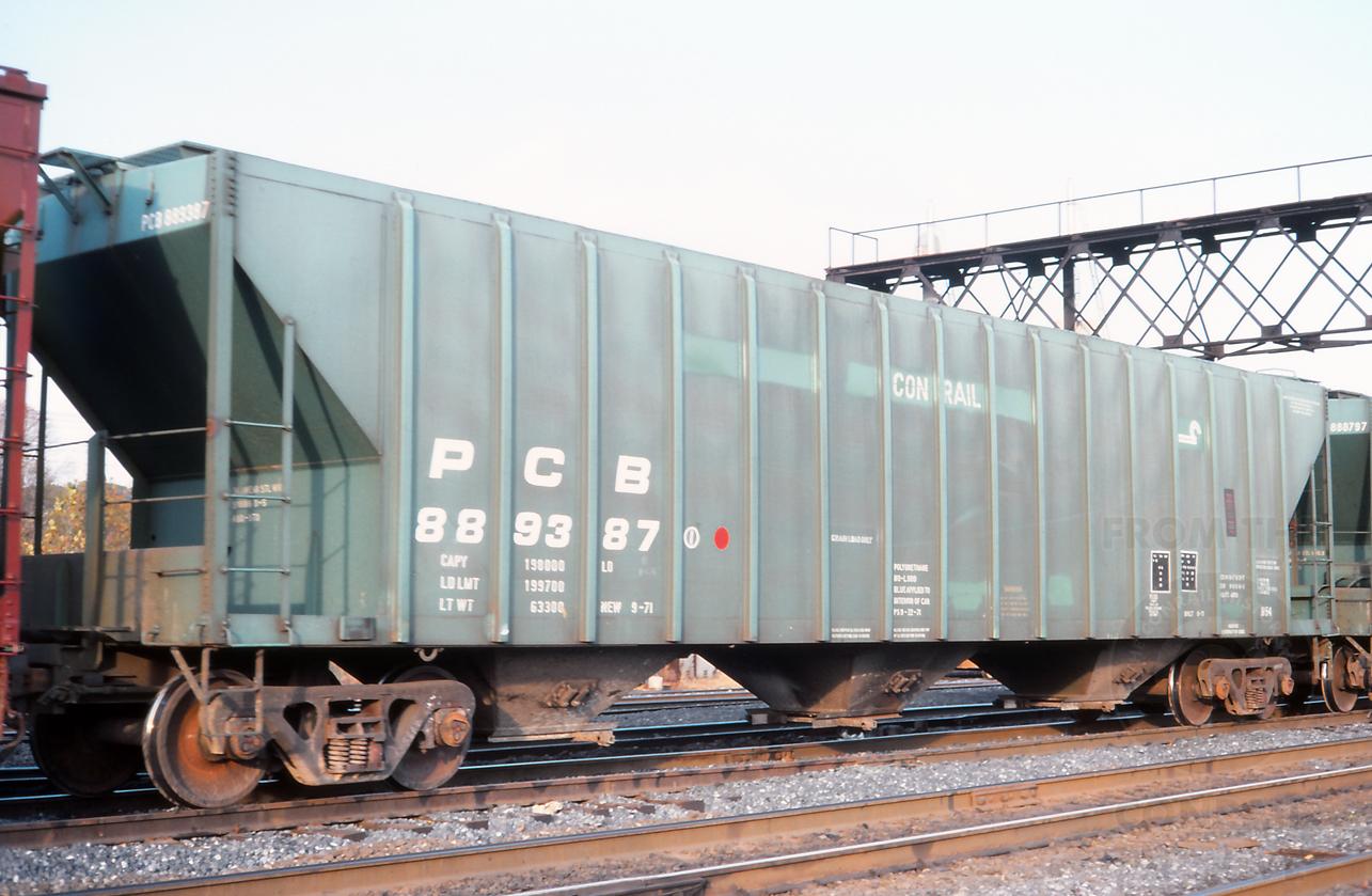 Car was built 9-71. Interesting that the PC name has been painted out and replaced with "CONRAIL" and the canopener, but it still retains its original PCB reporting marks.