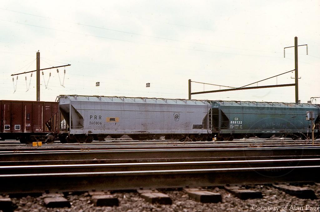 PRR class H45 covered hopper 260806 is coupled to a second H45 at Morrisville yard in March, 1981. The second hopper, a former PRR H45 is now renumbered CR 888133.