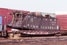 Ouch... this PRR 672595 H39 hopper sure took a hard hit. It has been loaded on flat CR 719106 possibly for a trip to Hollidaysburg.