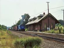 WNHA-22 arrives at the old Windsor Locks depot, where he will pause for a moment to let a crewman dismount and line the switch for the Suffield branch. Amtrak's Springfield line was still double track at this point in time, but was single-tracked around 1989-1990. Now Amtrak is restoring the second track between CP HOLTS in Meriden and CP NEW in Newington.