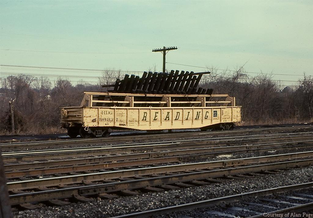 RDG MOW gondola 36331 rests by the Abrams yard signal tower in February, 1977.